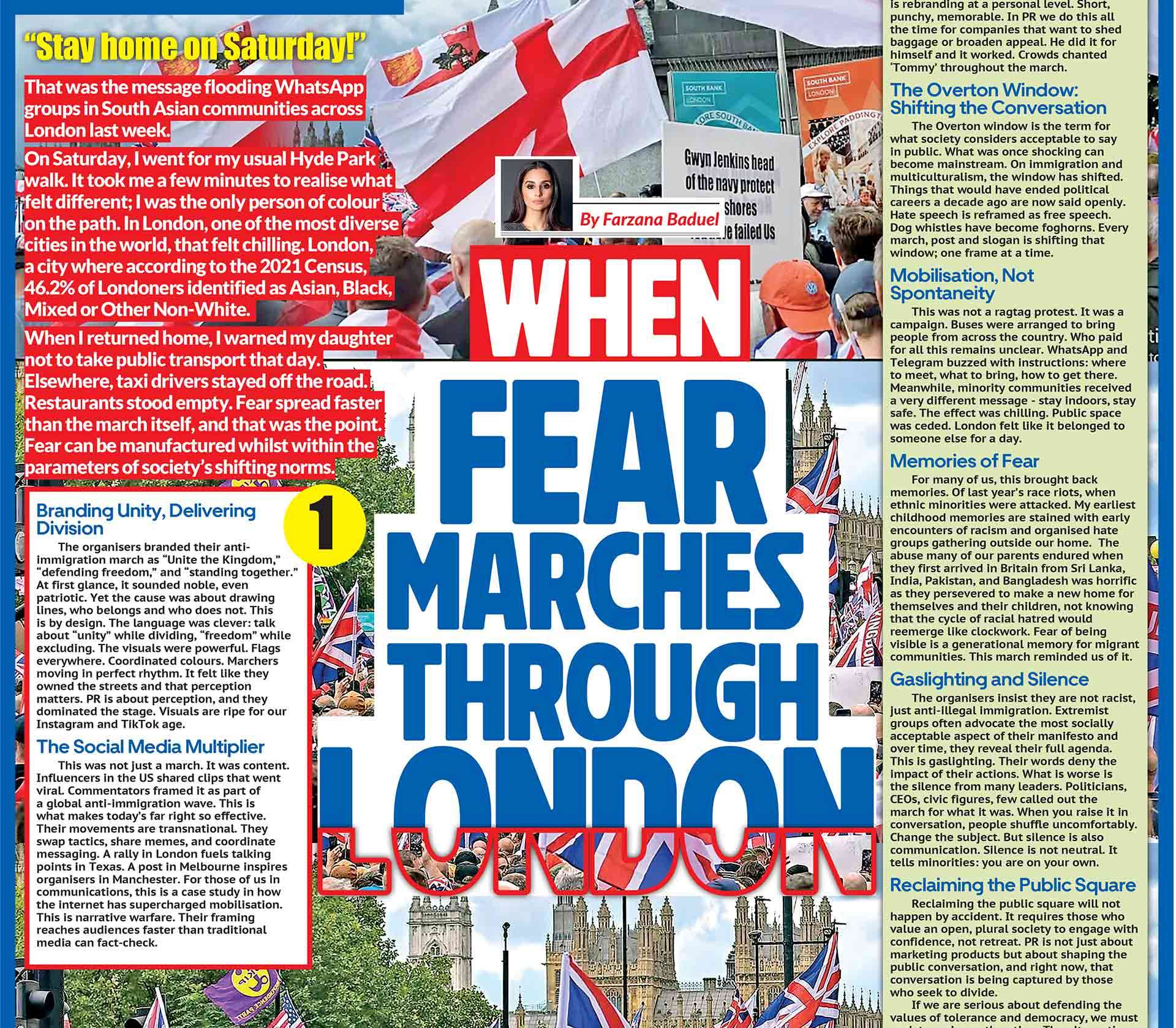 This was not a ragtag protest. It was a campaign. Buses were arranged to bring people from across the country. Who paid for all this remains unclear. WhatsApp and Telegram buzzed with instructions: where to meet, what to bring, how to get there. Meanwhile, minority communities received a very different message – stay indoors, stay safe. The effect was chilling. Public space was ceded. London felt like it belonged to someone else for a day.